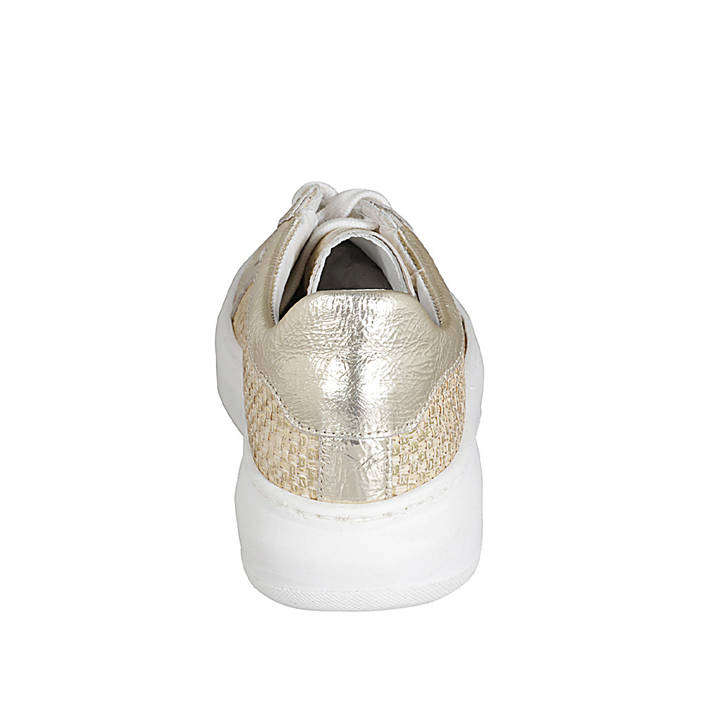 Woman's laced shoe with removable insole in platinum laminated leather and braided fabric wedge heel 4