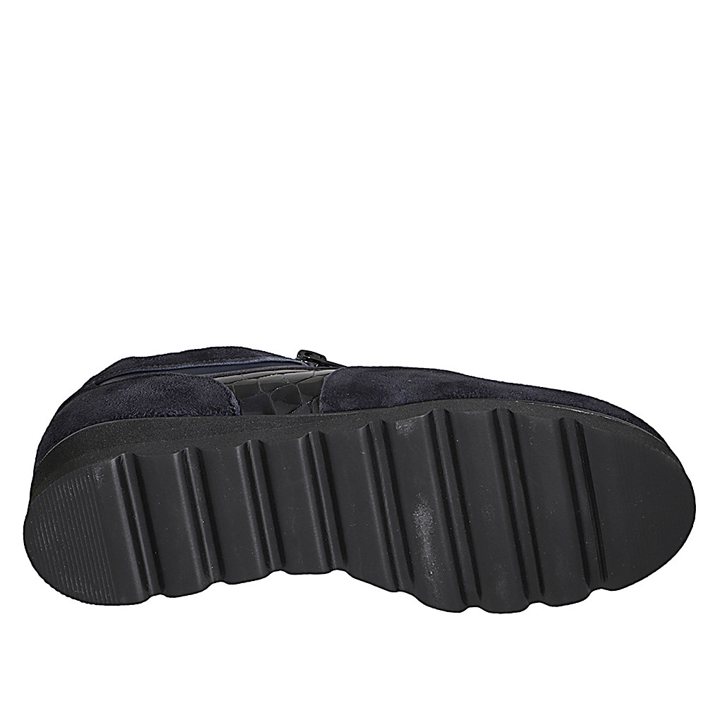 Woman's sneaker with zippers and removable insole in blue suede and printed patent leather wedge heel 3