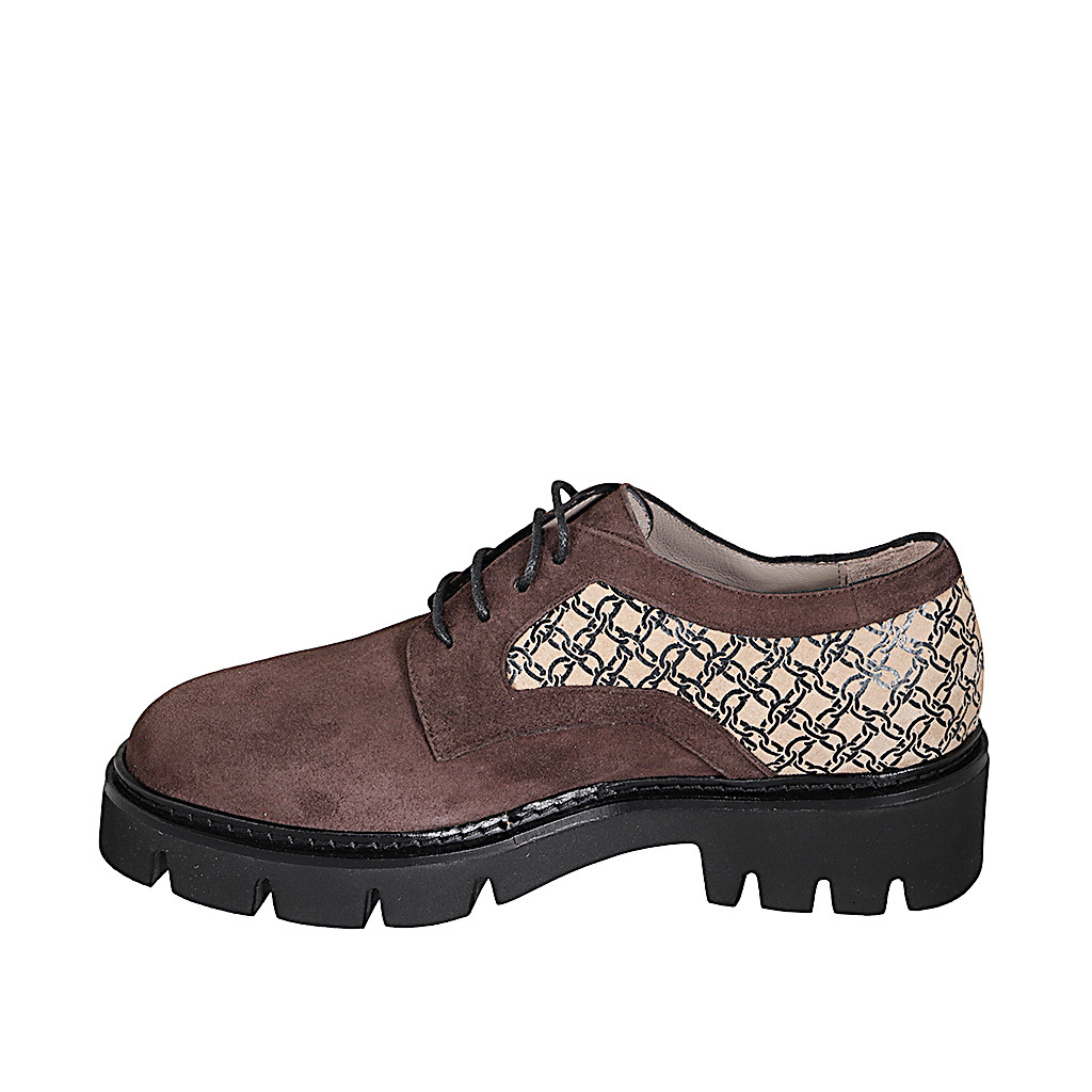 Woman's laced derby shoe in brown and beige printed suede heel 4