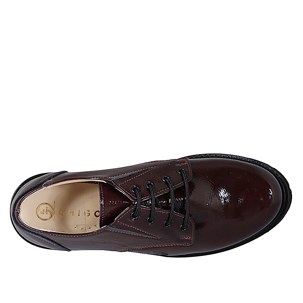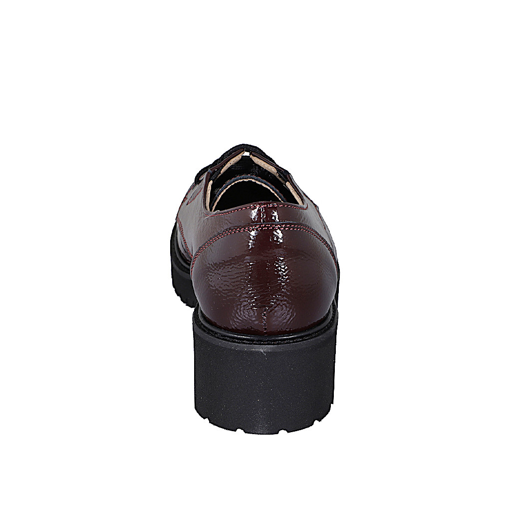Woman's laced derby shoe in maroon patent leather with elastics heel 4
