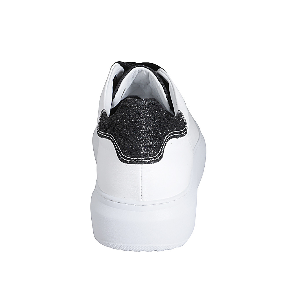 Woman's laced shoe with removable insole in white and black glittered leather wedge heel 4