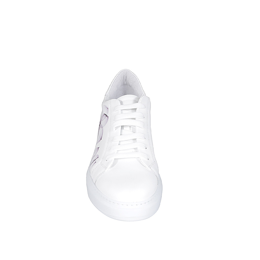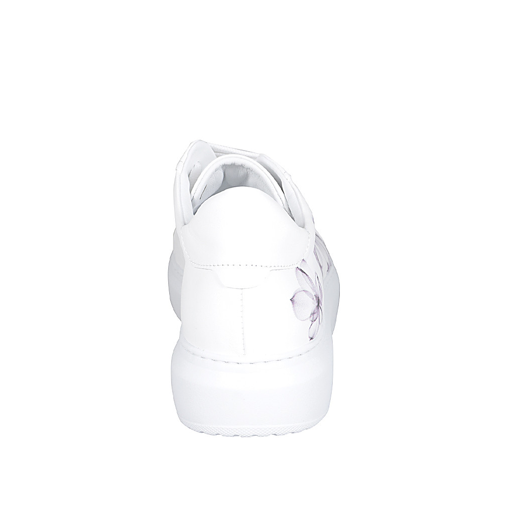 Woman's laced shoe in white and purple floral printed leather with removable insole wedge heel 4