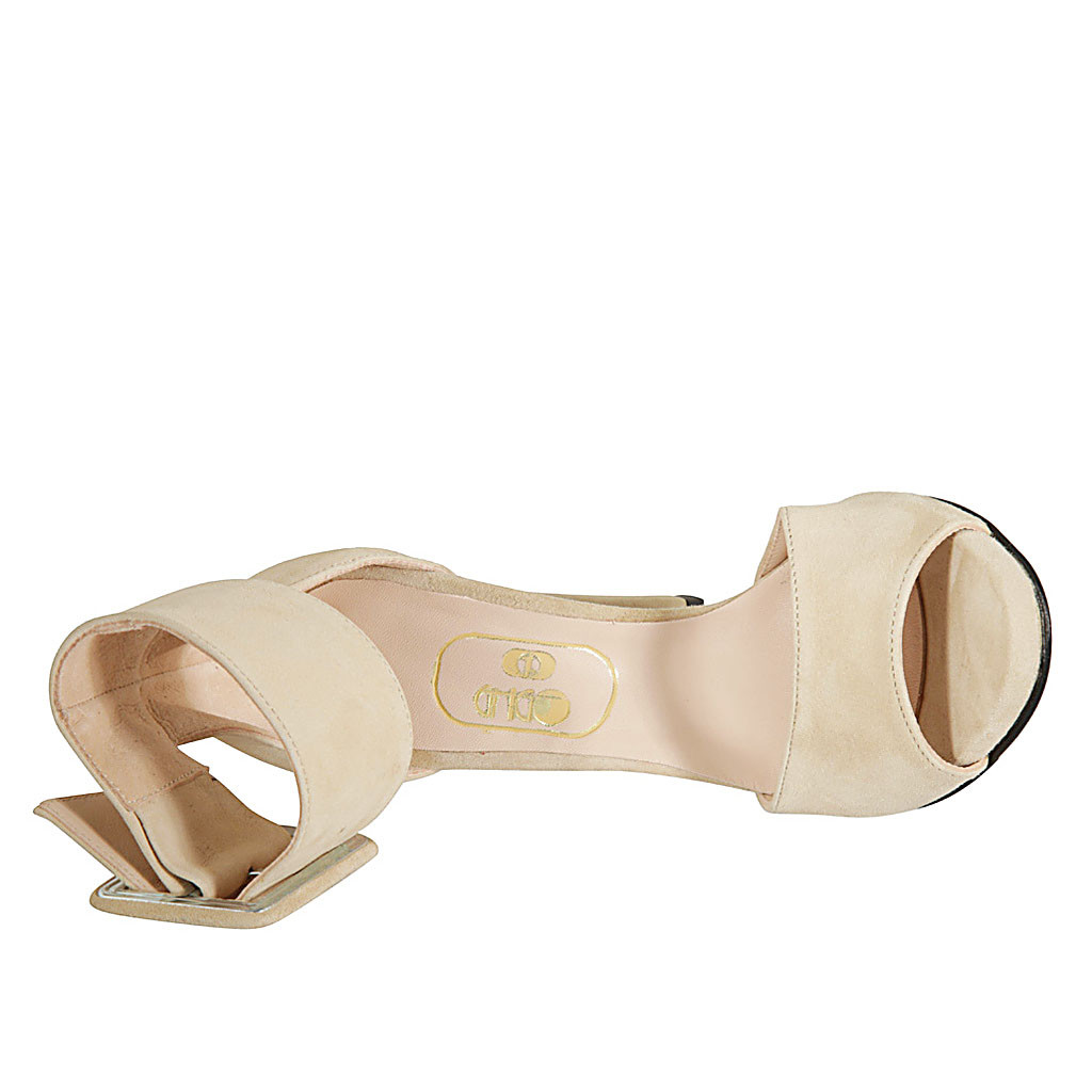 Женские сандали с пряжкой на щиколодке из бежевой замши каблук 11 нестандартные размеры