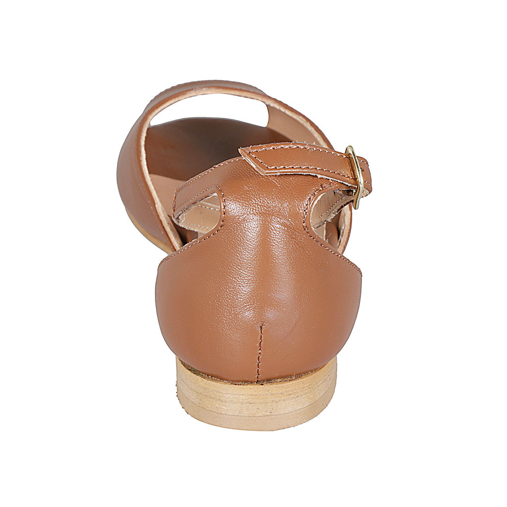 Woman's open shoe with ankle strap in cognac brown leather heel 2