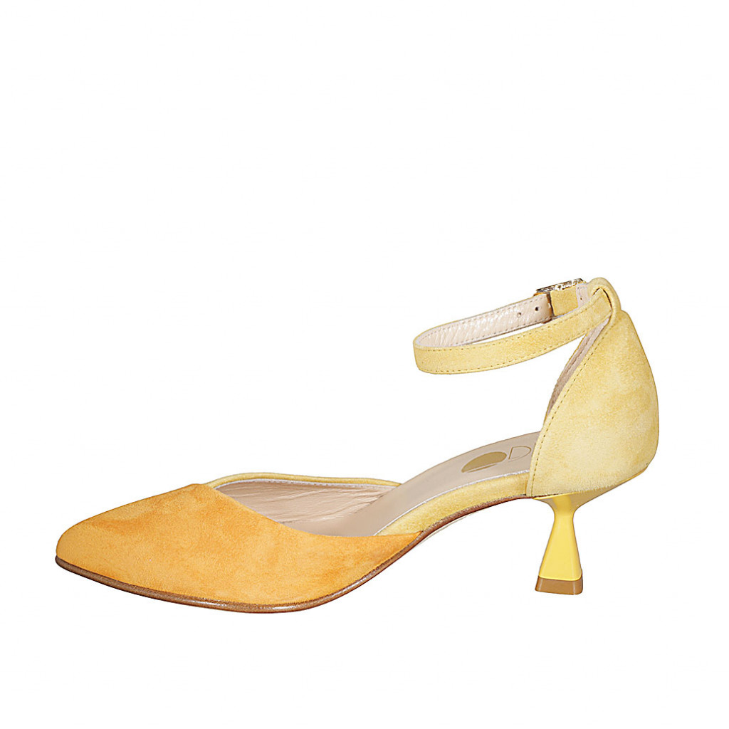 Woman's pointy open shoe with strap in yellow and orange suede heel 6
