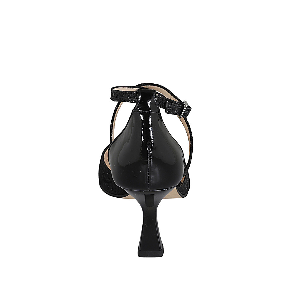 Woman's pointy open shoe with crossed strap in black patent leather and laminated fabric heel 8