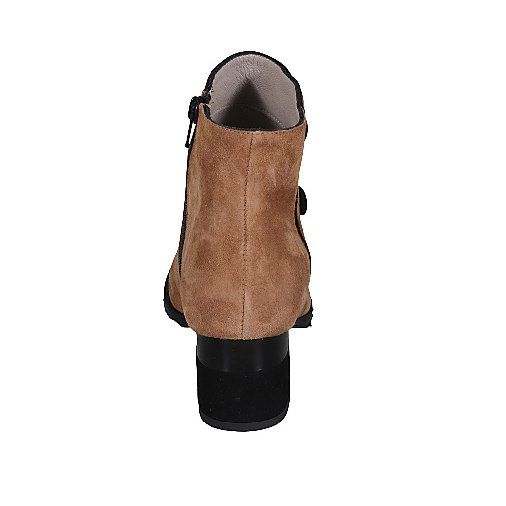 Woman's pointy ankle boot with zipper and buttons in cognac brown and black suede heel 5