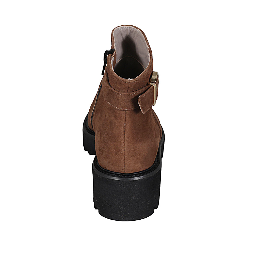 Woman's ankle boot with zipper and buckle in cognac brown suede heel 5