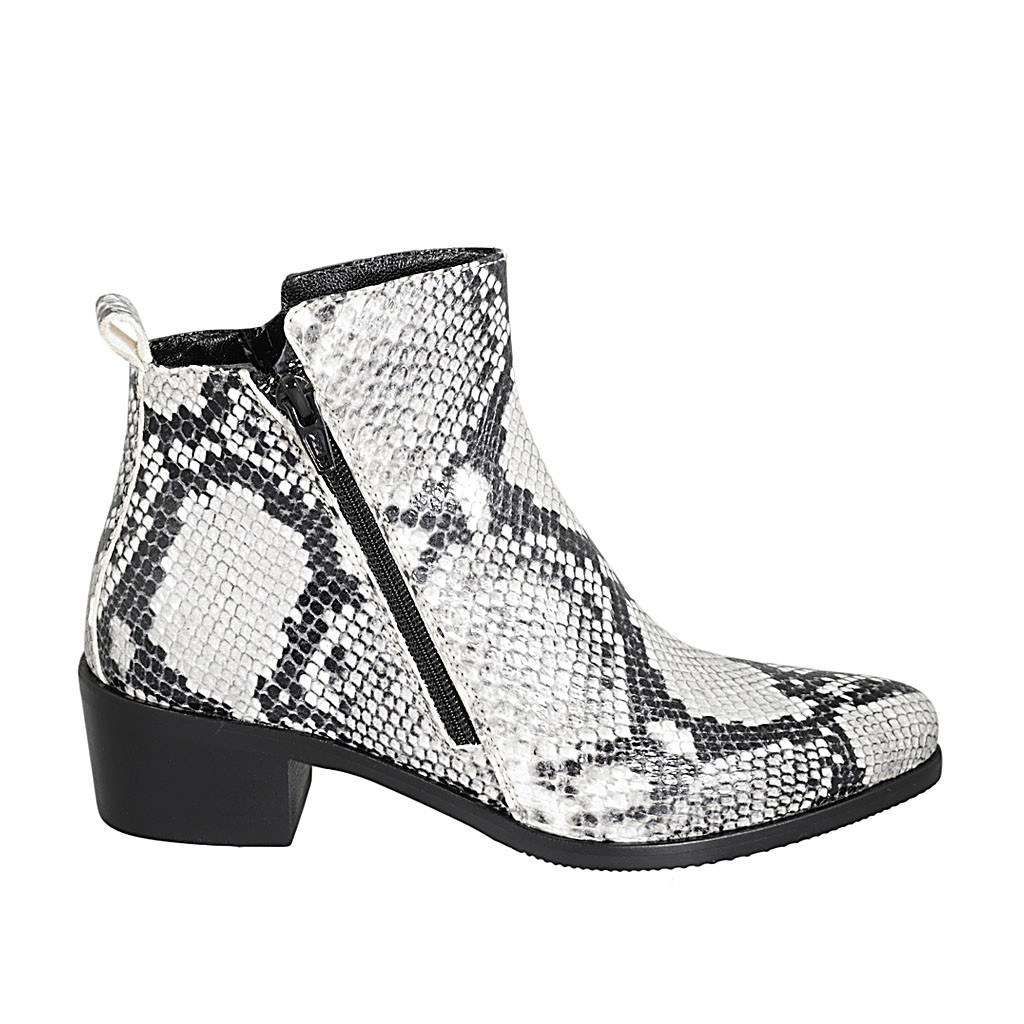 Woman's pointy texan ankle boot with zippers in black and white printed leather heel 4