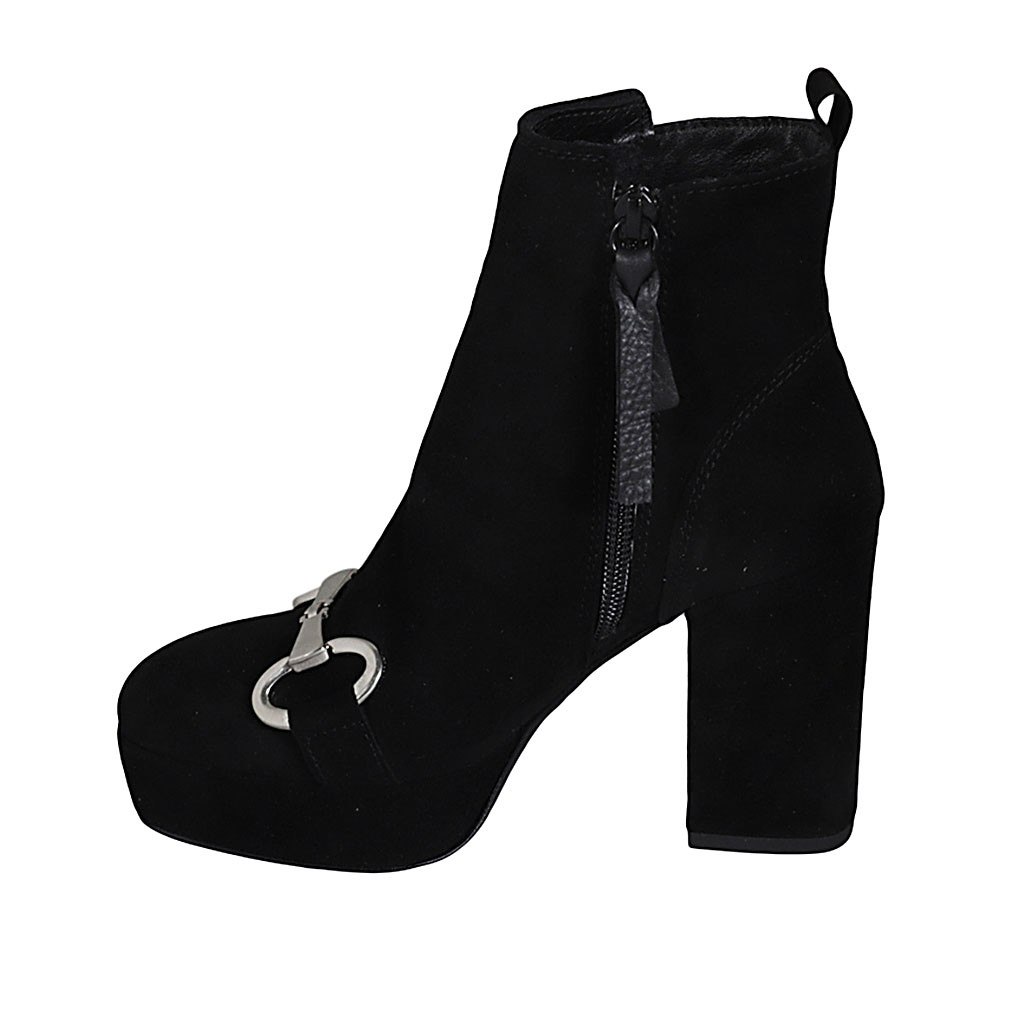Woman's ankle boot with zipper, platform and accessory in black suede heel 10