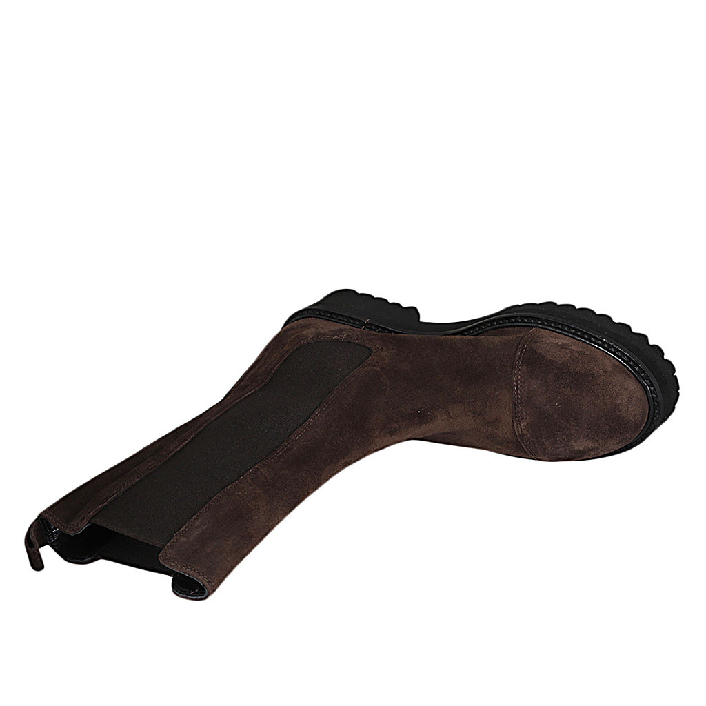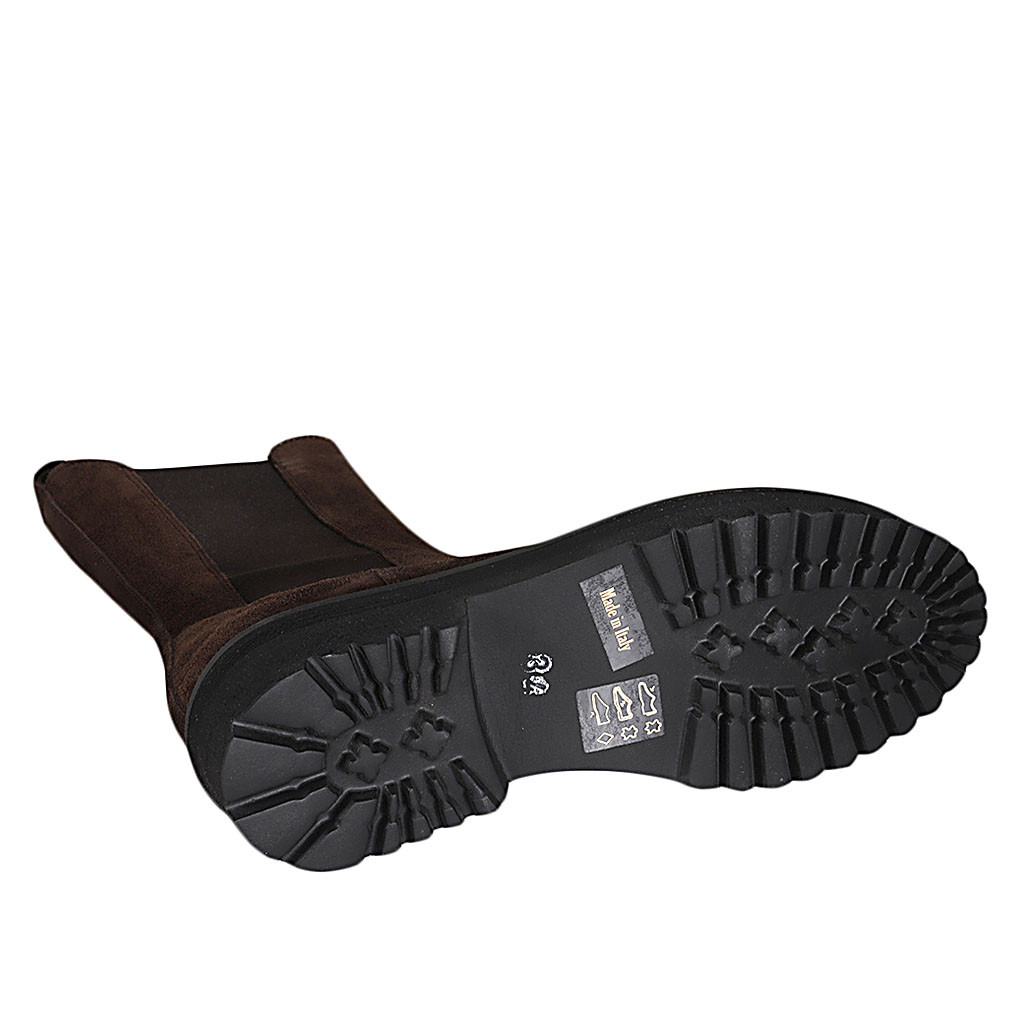 Woman's high ankle boot in brown suede with elastic bands and captoe heel 4
