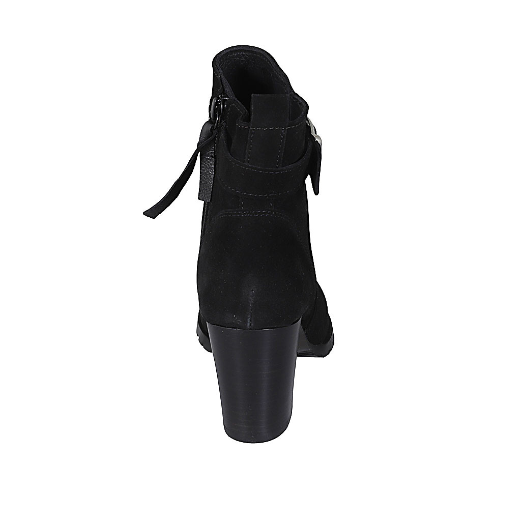 Woman's ankle boot with zipper and buckle in black suede heel 7