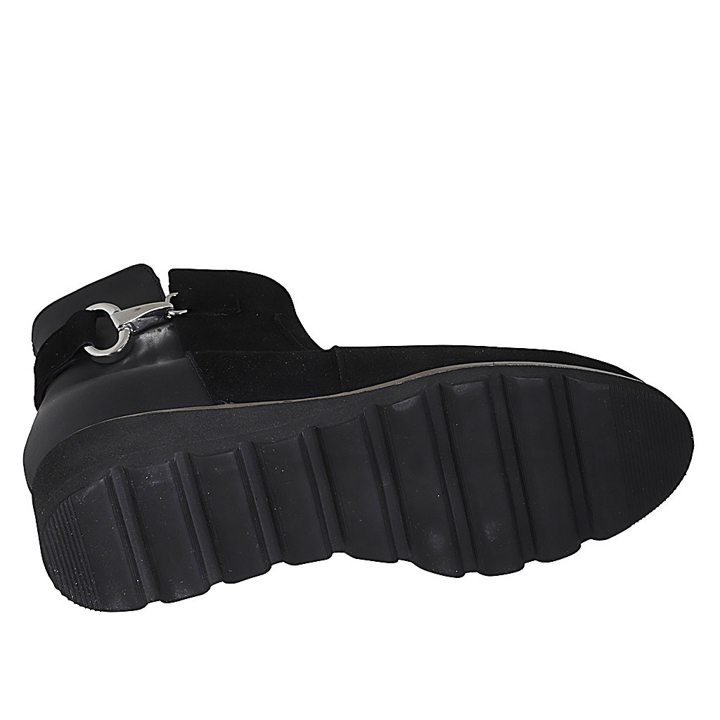 Woman's ankle boot with removable insole, accessory and zipper in black suede and leather wedge heel 4