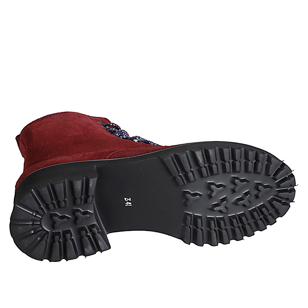 Woman's laced ankle-high boot with multicolored laces and inner zipper in bordeaux suede heel 5