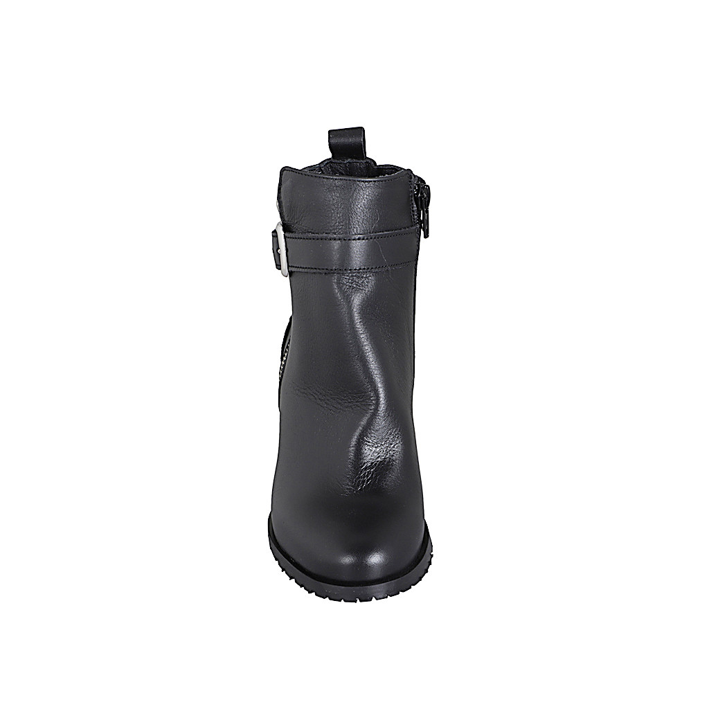 Woman's ankle boot in black leather with zippers, buckle and round tip heel 7