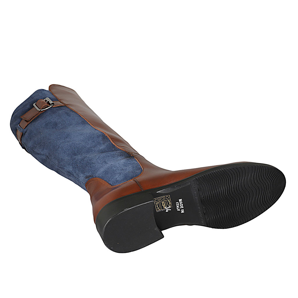Woman's boot with zipper and buckle in cognac brown leather and light blue suede heel 3