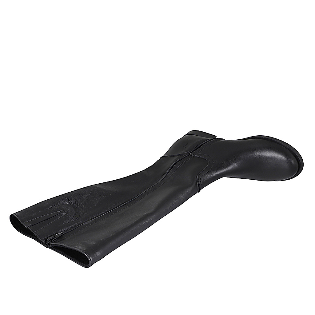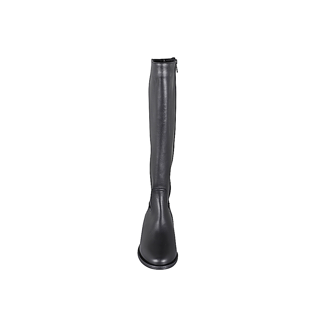 Woman's pointy ankle boot in black suede with inner zip and black patent leather captoe heel 2